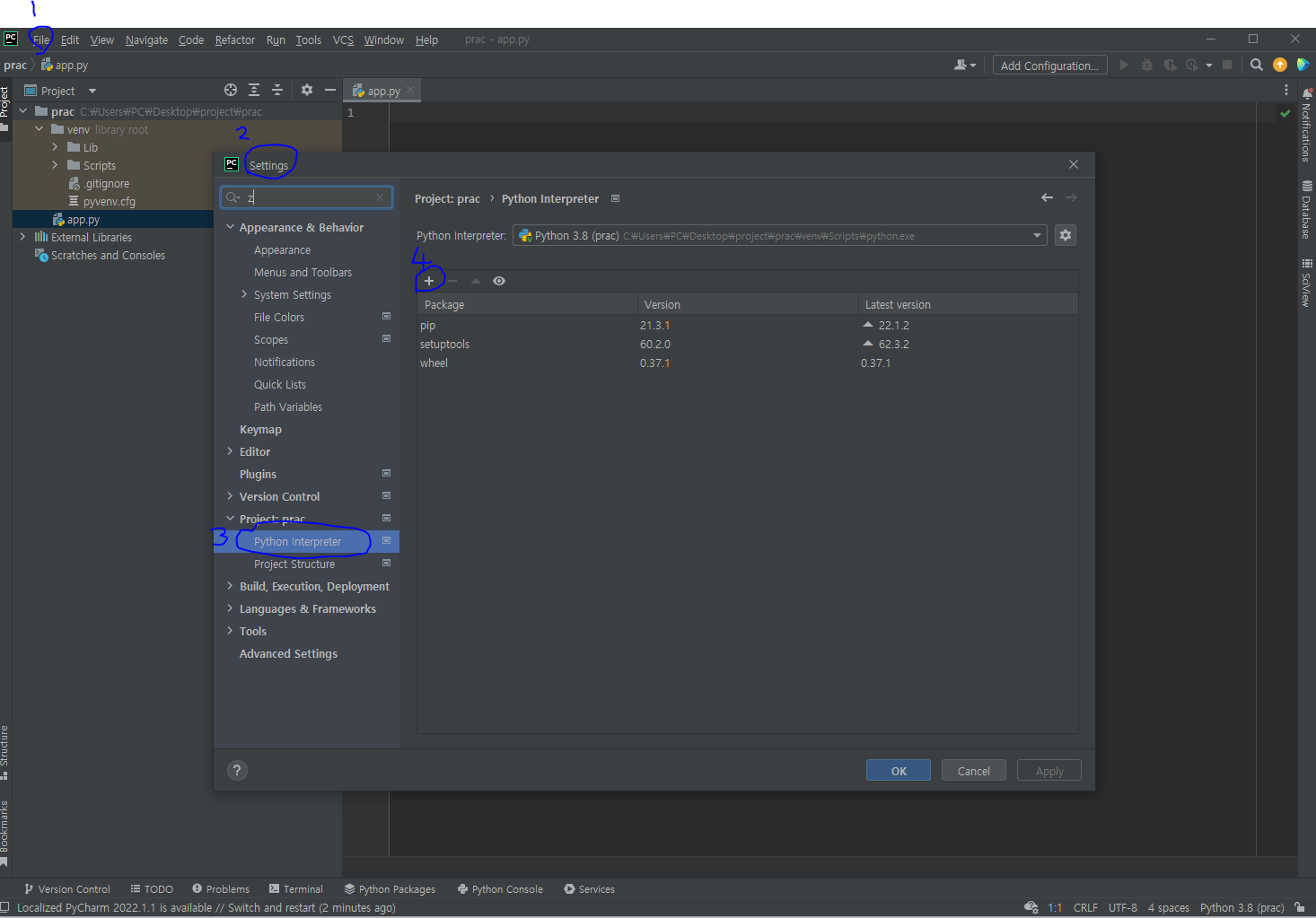 File - Settings - Python Interpreter - + 버튼 - flask 검색 - install